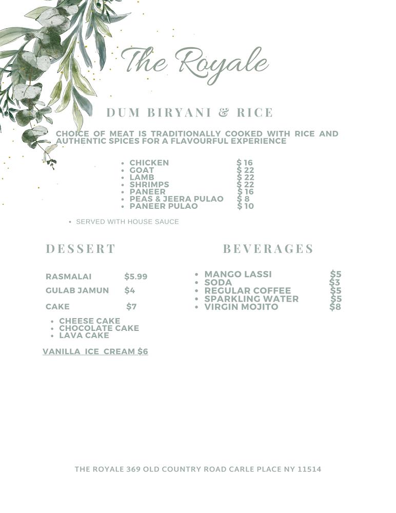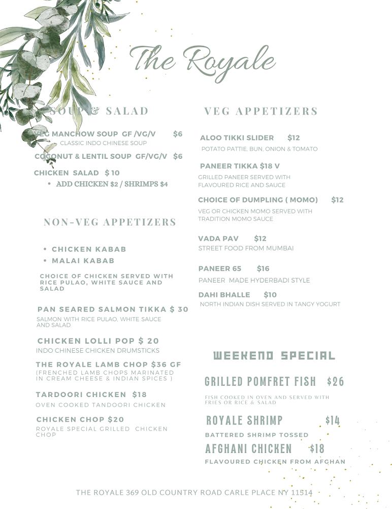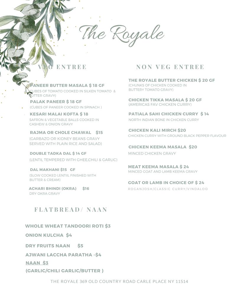 Welcome to The Royale Restaurant, your go-to destination for authentic Indian cuisine in Carle Place, NY. Our meticulously crafted menu ensures an unforgettable dining experience, with dishes tailored to your individual palate. Enjoy a warm, inviting atmosphere complemented by courteous staff committed to your comfort. Whether you're dining in, ordering takeout, or utilizing our convenient delivery services, The Royale is dedicated to excellence. Explore our extensive offerings, including vegetarian options, happy hour specials, and a delightful selection of beverages. Join us at 369 Old Country Rd and savor the flavors of India today!